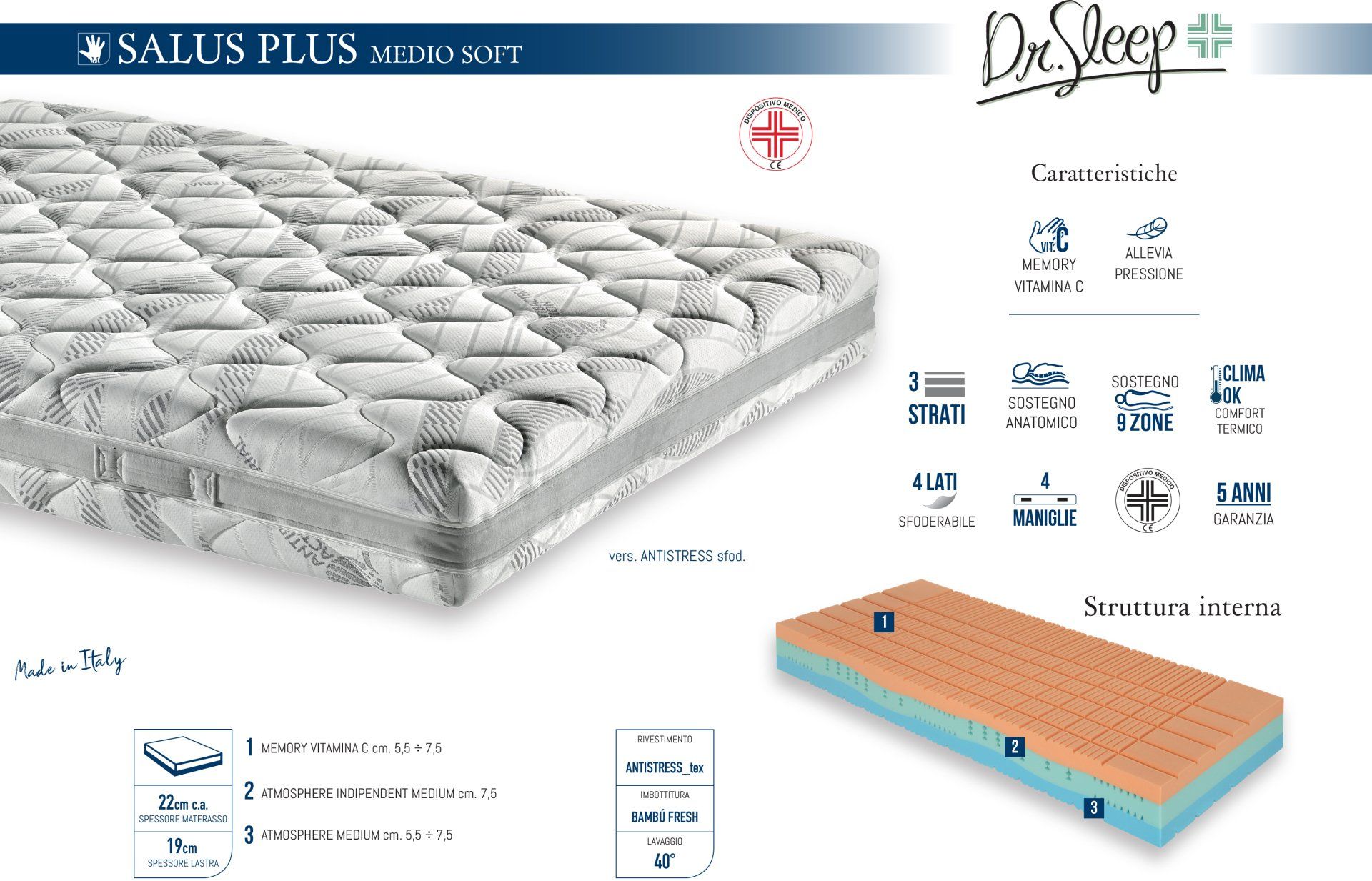 Salus Plus medio-soft nasce per essere il partner perfetto durante la notte. Il memory alla Vitamina C dona una piacevole sensazione di accoglimento allevia pressione. Lo strato centrale con il sistema a zone indipendenti medium, aumenta la sensazione progressiva di sostengo in ogni singolo punto di appoggio del corpo.